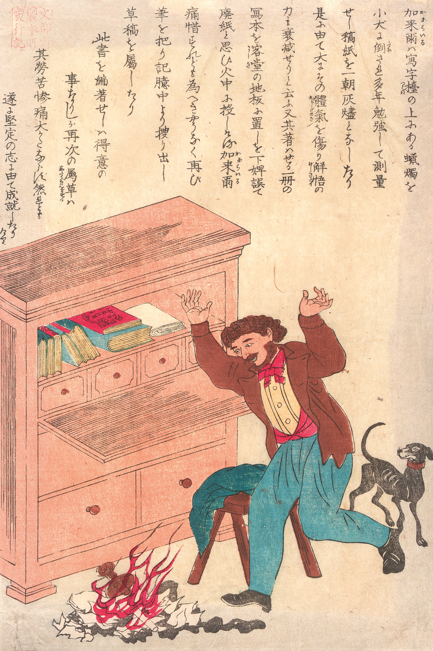 III. (Utagawa-Schule). (Der schottische Historiker Thomas Carlyle). Darstellung der Anekdote um die verbrannten Manuskripte Carlyles nach einem Missgeschick mit einem Hund. Ca. 1850-1900.