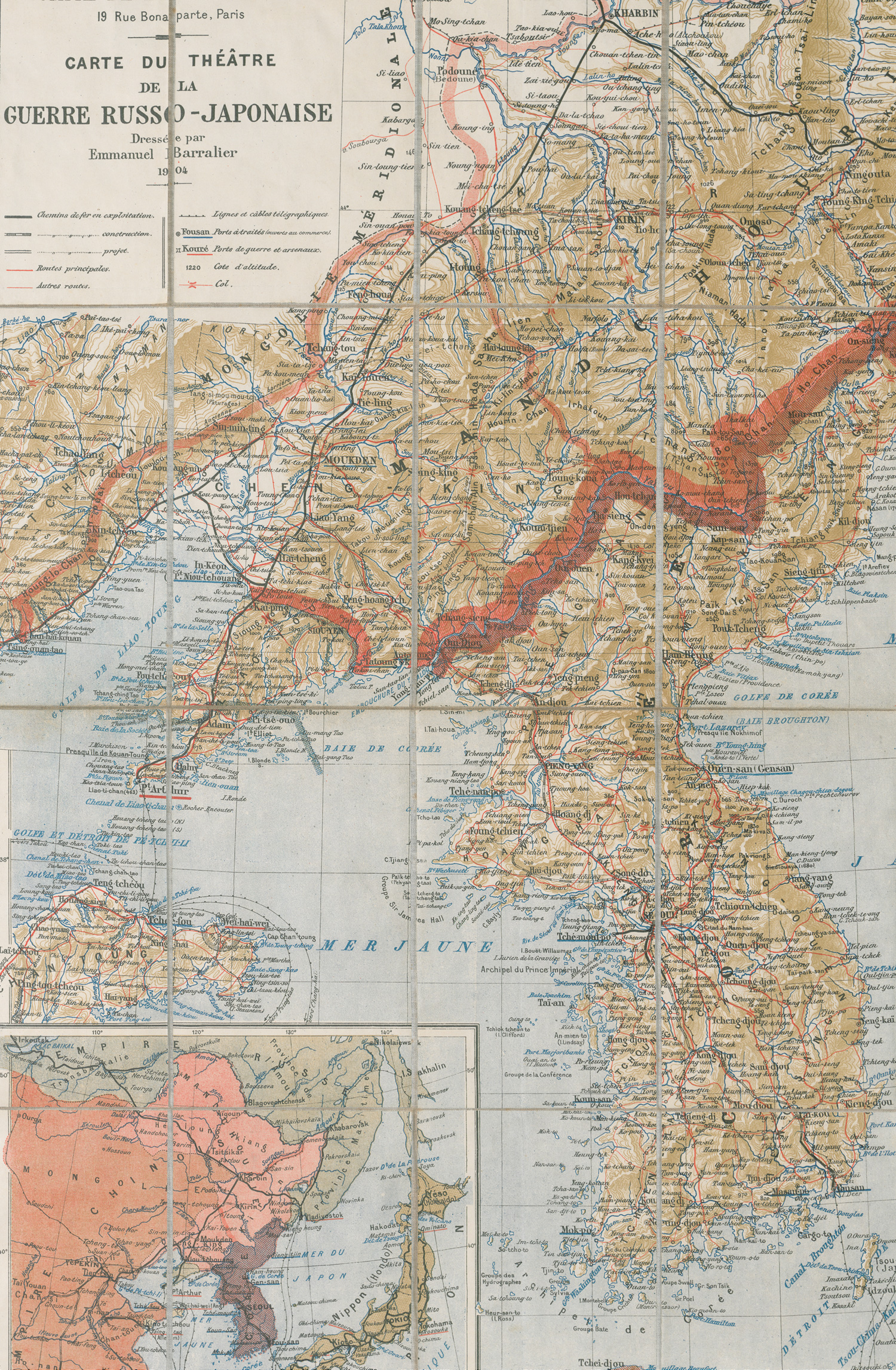 Karte des Russisch-Japanischer Krieges von Emmanuel Barralier. Mit großer Titelkartusche und Insetkarte. – Papierbedingt leicht gebräunt und leicht braunfleckig, sonst gutes Exemplar.